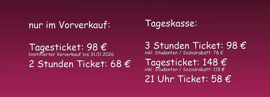 Die Vorverkaufskarten gibt es bei uns vor Ort am Eingang gegen Barzahlung, EC-Bankkarte, Mastercard oder VISA.